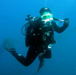 Before you can actually start shooting underwater, you will need to get in the water. In Laguna Beach, we do a lot of shore dives directly off the beach and getting in the water that way has an impact on your camera as well. You will need to secure your camera before you enter the surf zone. I found it usefull to attach my camera using its provided wrist strap on my left wrist where I also have my computer. The computer prevents the strap from sliding which will prevents it from getting loose even in tough surf (unless I lose my computer too, which will be deserved because I shouldn't be diving in 8 ft waves anyway). Once past the surf zone and once my fins are secured, I then swap the camera to my right wrist and I'm ready to shoot! As I'm using my right hand a lot of to put up my fins I found that this method frees my right hand and the camera never gets in the way. If you're a lefty you may want to try the contraryI've seen others secure their camera to their BC (see picture on the left). I tried this when I started underwater photography and the strap I had my camera attached to simply broke. Snap. Just like that. I wasn't even in the surf or anything. I even think it was during my trials in the swimming pool... Anyway, without this strap I had to find another way and found out that the provided wrist strap always did the job. I'm now use to my wrist strap and I think I have enough crap hanging out of my BC, adding the camera would be a nightmare. It's even worse when you add external flashes which have the tendancy to make your camera negative underwater... Perfect recipe to harvest sand!