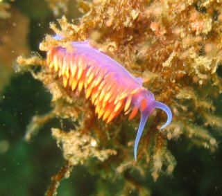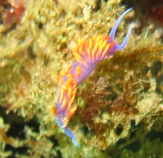 When diving in Laguna Beach, it often feels like diving in a washmachine. When it come to underwater photography, even a mild surge is a pain in the ass. The problem is that whatever you shoot, you'll have to fight the surge. If you shoot an all-seeing-eye (see right) immobile on the rock, you're in the surge and the subject is moving relative to you (even though you're the one movig). If you wanna shoot a Spanish Shawl, it's in the surge, moving and you're in the surge moving too. Even though you're both in the same surge, your repective inertia being a little different (you're a little heavier than a Spanish Shawl, even a big one), you're not really moving in concert! To get a good shot you'll have to time it when the surge is at its peak when its speed is zero (i.e you and the slug are both immobile). All the more reason why buoyancy control is of the outmost importance!