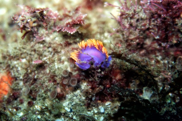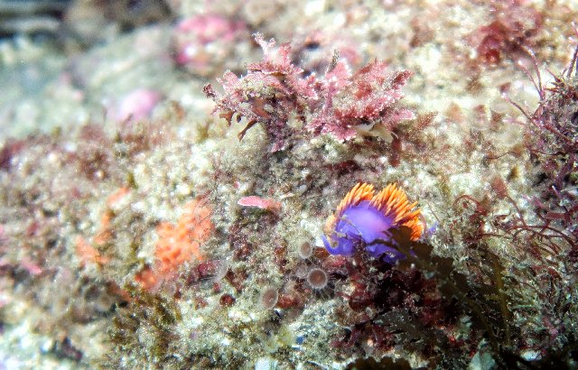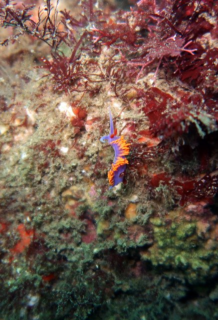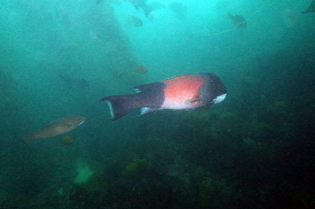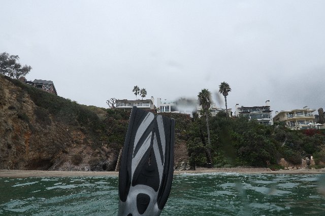 Conditions were not that great after all. Since I did not have a computer, I decided to play it safe and dove the periphery of the reef going South-West towards Seal Rock. I had 3,500psi (230bar) so I was not too worried about air consumption. Temperature was OK, around 60F (16°C) and my Chinese wet suit was keeping me sufficiently warm. I did not see anything out of the ordinary. A couple of bugs, lots of sargo, kelp bass and sheephead congregating in some areas and a few Spanish Shawls. Not a lot of pictures, all Tv 1/125s with flash on. At 2,000psi I was starting to get a wee bit cold, so I decided to turn around. The current was not as weak as I had thought it would be. It was supposed to be high tide, I was expecting calm. It was not. I got disoriented a couple of times, once bad enough to decide to surface, thinking my compass had also given up. It had not. It was working fine, my navigation, as usual, was sketchy. I started getting cramps. Bad ones. After surfacing to get my bearings, I had realized I was pretty far from the beach, so getting cramps at 30ft and still having to go all that way suddendy made the whole solo-diving thing a bit silly. Fighting the pain, may air went from 2,000psi to 1,000psi in about a minute. I was struggling. I decided to hang on a kelp pod to relax, trying to get rid of the pain. It worked. I was able to resume the slow way back to the beach. Navigation got screwed up again, I had to surface, but at least I was getting close. I made it back to the beach in one piece, equipment and all. Contrary to the computer, the fin strapped survived.